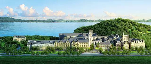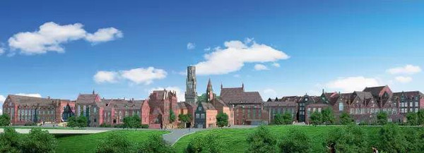 參考在人文科學(xué)上聞名的、在德國(guó)具有.悠久歷史的海德?tīng)柋ご髮W(xué)的建筑風(fēng)格,以紅砂巖外墻和傳統(tǒng)街區(qū)構(gòu)成建筑群,布置在小山丘上細(xì)致而雄偉的城堡和網(wǎng)格狀的街區(qū)形成了鮮明的對(duì)比.