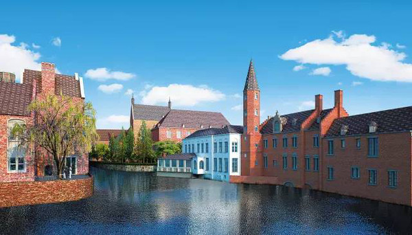 參考比利時(shí)城市布魯日連綿小建筑物的街區(qū).點(diǎn),結(jié)合紅磚外墻、階梯式陡坡屋.等外觀.征,以及.具.色的鐘塔和拱形石橋設(shè)計(jì),形成了與自然環(huán)境契合的街區(qū)空間.