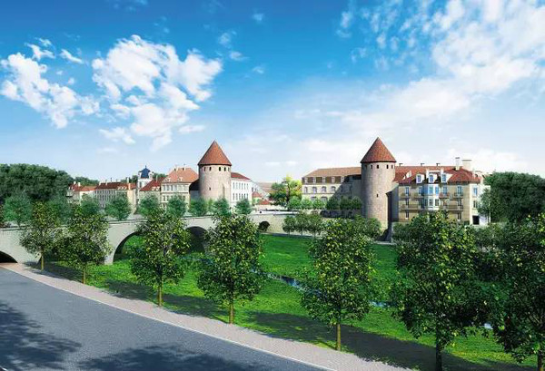 參考捷克小鎮(zhèn)克倫諾夫的城堡、教堂、修道院等大型建筑的建筑.色,整合蜿蜒曲折、壯麗秀美的河流,構(gòu)成尺度宜人的步行空間.