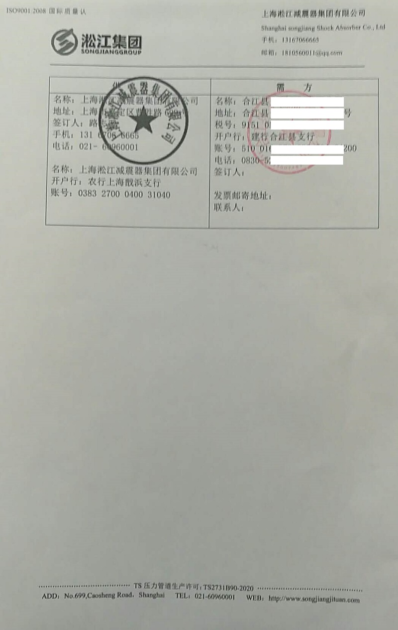 上海淞江減震器集團有限公司官方網站為您介紹:【四川合江天華富邦化工】橡膠接頭合同信息,淞江集團為眾多化工企業提供各種橡膠接頭產品,以下是為四川合江天華富邦化工提供25kg橡膠接頭介紹。
