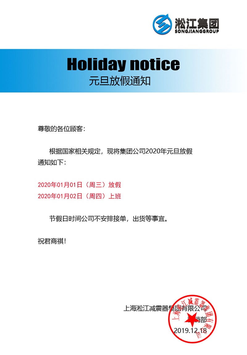 上海淞江減震器集團有限公司官方網站為您介紹:【元旦】2020年元旦放假通知信息,淞江集團根據國家相關規定,現將集團公司2020年元旦放假通知如下。【元旦】2020年元旦放假通知
